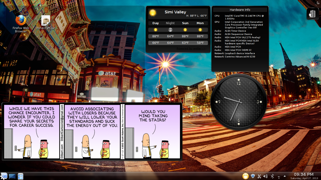 I have used Gnome or Unity for most of my linux running days and really get how to use them and why they are great graphical interfaces but there was always something missing, something that is well integrated to the KDE plasma desktop: Widgets. These little boxes of quick, useful information make it great to turn on and immediately see what you need (for me it is the latest Dilbert comic and my CPU stats.